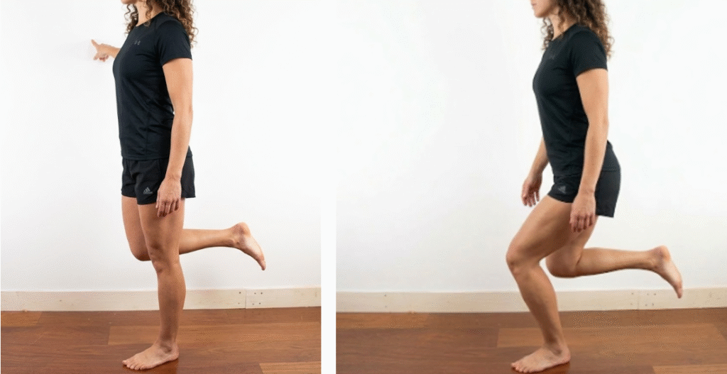 - Maintenant, fléchissez le genou de la jambe d’appui sans poser l’autre pied au sol.