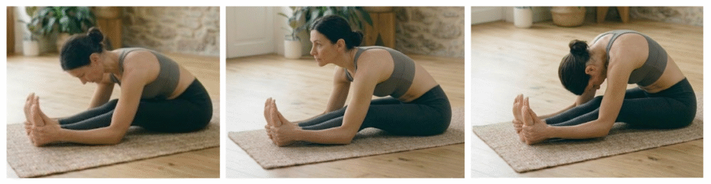 Je vous invite à observer ces images en Paschimottanasana (flexion assise) et, si vous le souhaitez, à les essayer. Notez comment la tension dans votre cou change juste en déplaçant le regard :